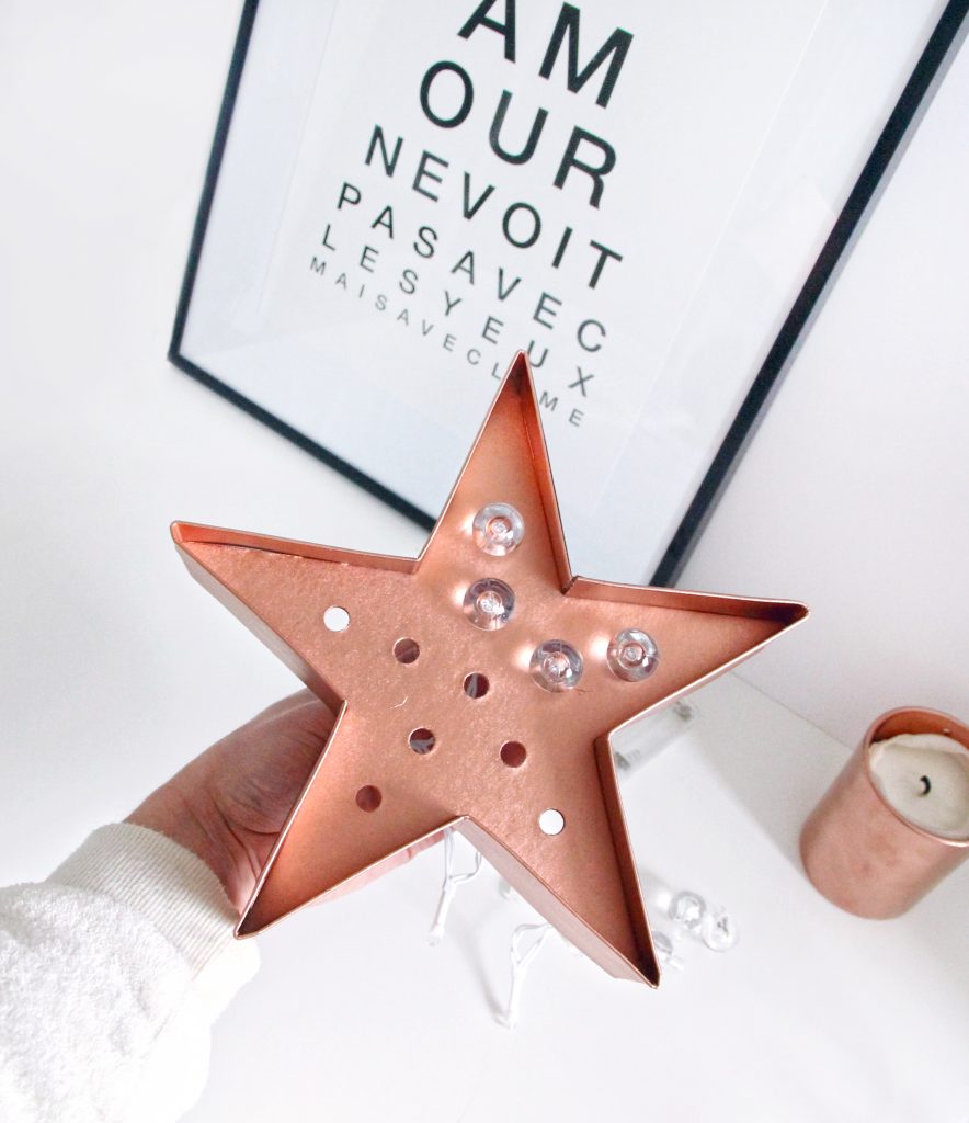 Vous recevez cette jolie étoile lumineuse en carton blanc avec les ampoules led et le boîtier à piles (2 piles AAA). Et c’est parti, faites place à votre imagination. Vous pouvez peindre l’étoile, mettre du masking tape, des paillettes… De mon côté j’ai préféré la peindre en cuivre dans la continuité de la déco de mon salon, il me restait en plus une bombe de cette couleur. Une fois votre étoile customisé, vous avez juste à faire rentrer les led dans les petits trous, mettre des piles, et le tour est joué 🙂